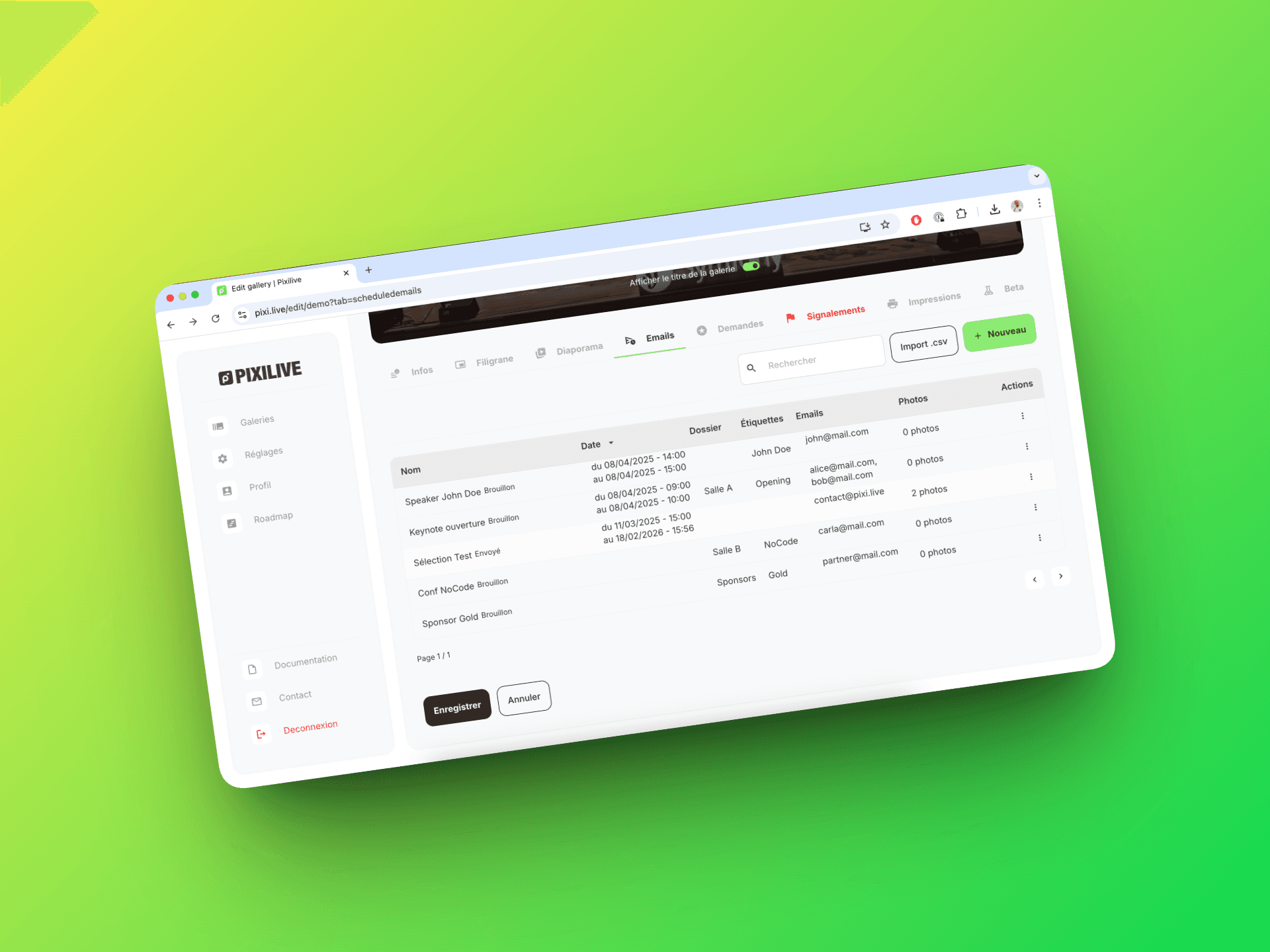 Pendant ou après l'événement, vous pouvez également faire une sélection d’images très précise depuis la galerie et l'envoyer par email à des destinataires spécifiques. Le meilleur des deux mondes : automatisation programmée + personnalisation sur-mesure.