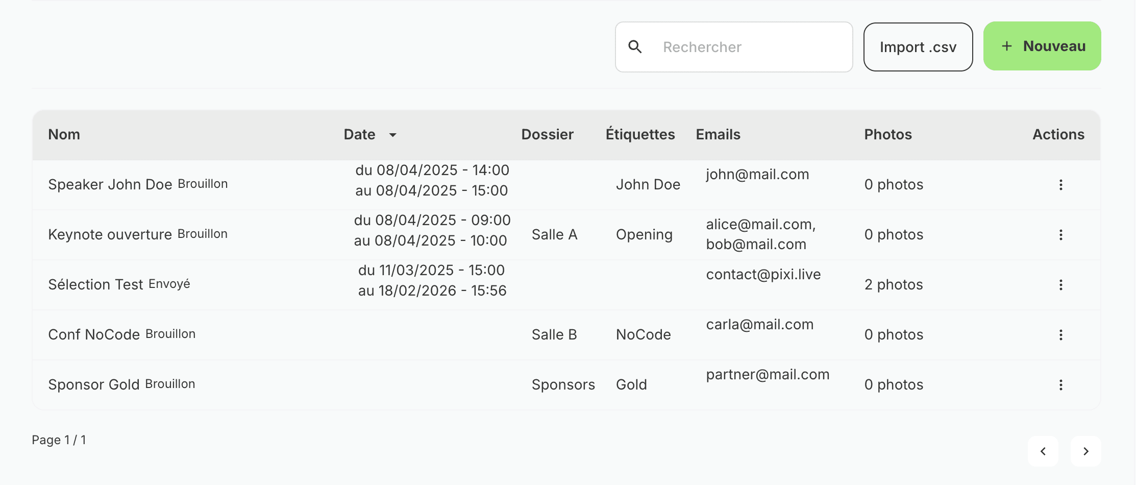 Nous avons conçu cette fonctionnalité comme une alternative simple à la reconnaissance faciale. Plutôt que d'imposer la reconnaissance faciale et la création de comptes obligatoires, Pixilive mise sur l'intelligence organisationnelle. Vous connaissez vos intervenants, leurs créneaux, leurs sujets. Chaque intervenant reçoit exactement les photos de SON contexte, sans collecte de données biométriques.